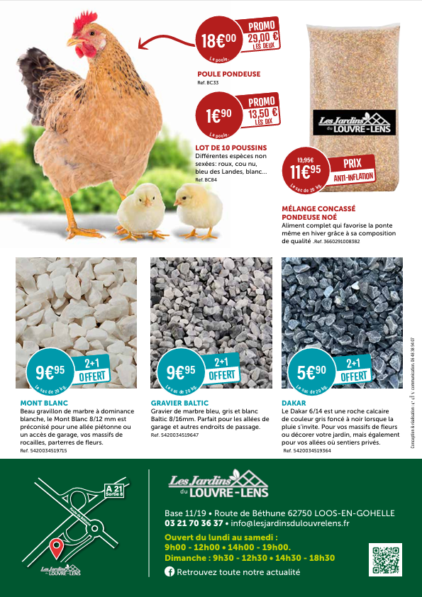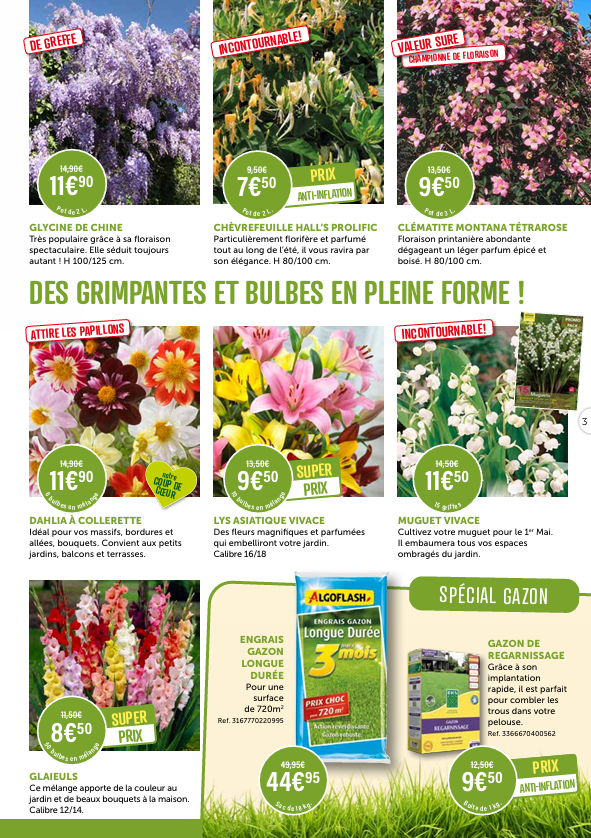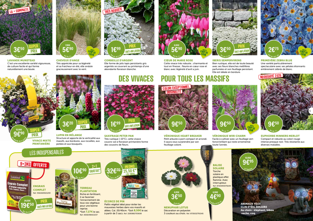 Le printemps s’installe doucement… et avec lui, nos offres spéciales du mois de mars ! C’est le moment idéal pour préparer votre jardin, embellir vos extérieurs et profiter de promotions sélectionnées pour accompagner le retour des beaux jours. Plantes de saison, équipements, idées déco ou gourmandises du terroir : découvrez dans notre tract toutes les offres pensées pour bien démarrer la saison.